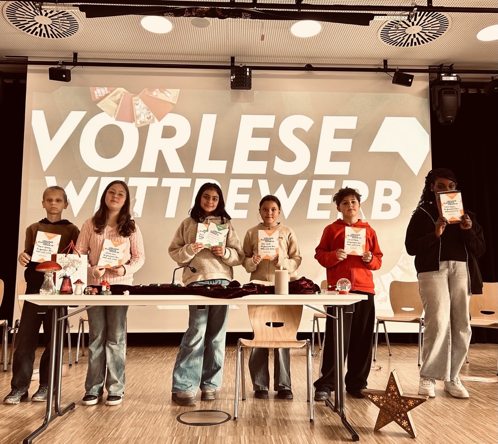 Am Freitag, den 5.12.2025, fand erneut unser Vorlesewettbewerb der sechsten Klassen statt. Wie Lara Henneke (7d), Siegerin des letzten Jahres und Jurymitglied, schreibt, waren „alle Kinder schon richtig aufgeregt, genauso wie die Jury und das Publikum“. Alle waren zu Anfang gespannt und wollten wissen, „welche schönen, tollen Bücher sich die Kinder ausgesucht hatten“.